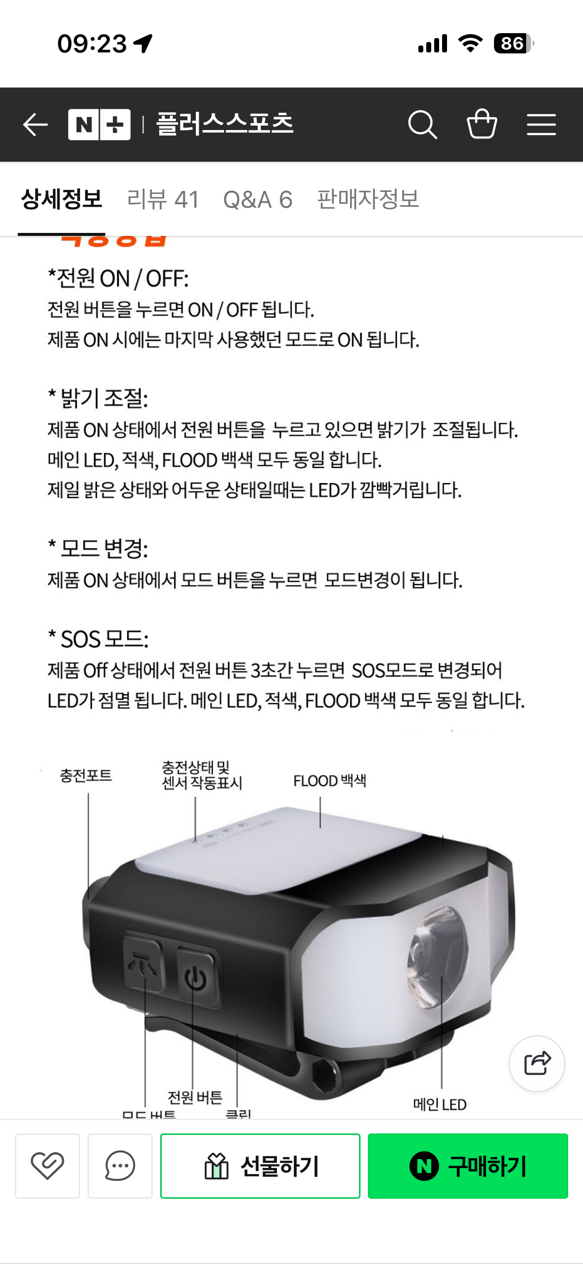 전원버튼을 누르면 on/off 밝기조절 - on 상태에서 전원버튼을 누르고 있으면 밝기가 조절 - 메인LED, 적색, UV 모두 동일 - 제일 밝은 상태와 어두운 상태일때는 LED가 깜빡저림 모드변경 - on 상태에서 모드 버튼을 누르면 변경 SOS 모드 - off 상태에서 전원버튼을 3초간 누르면 SOS모드로 변경되어 LED가 점멸됨